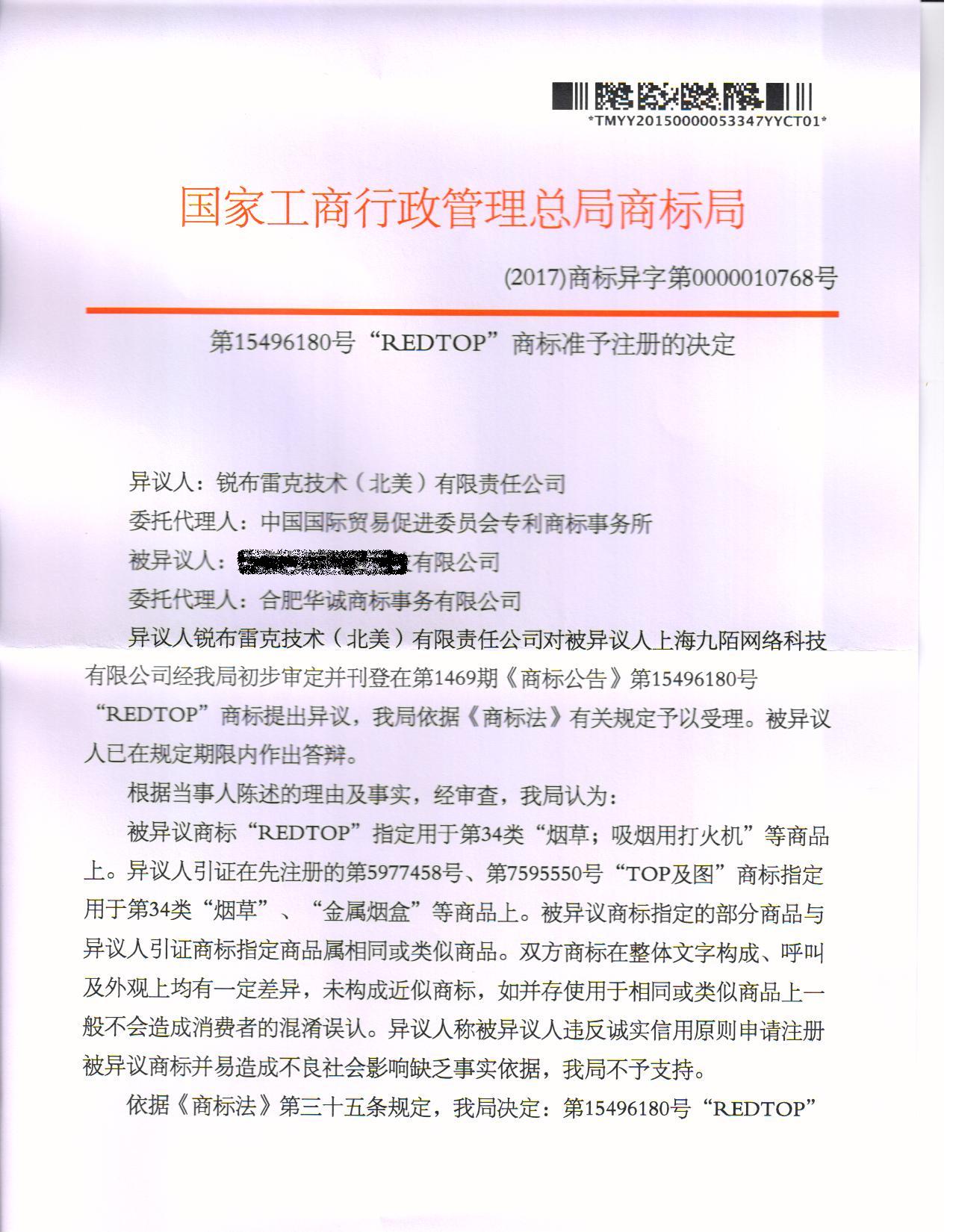 异议答辩成功裁定