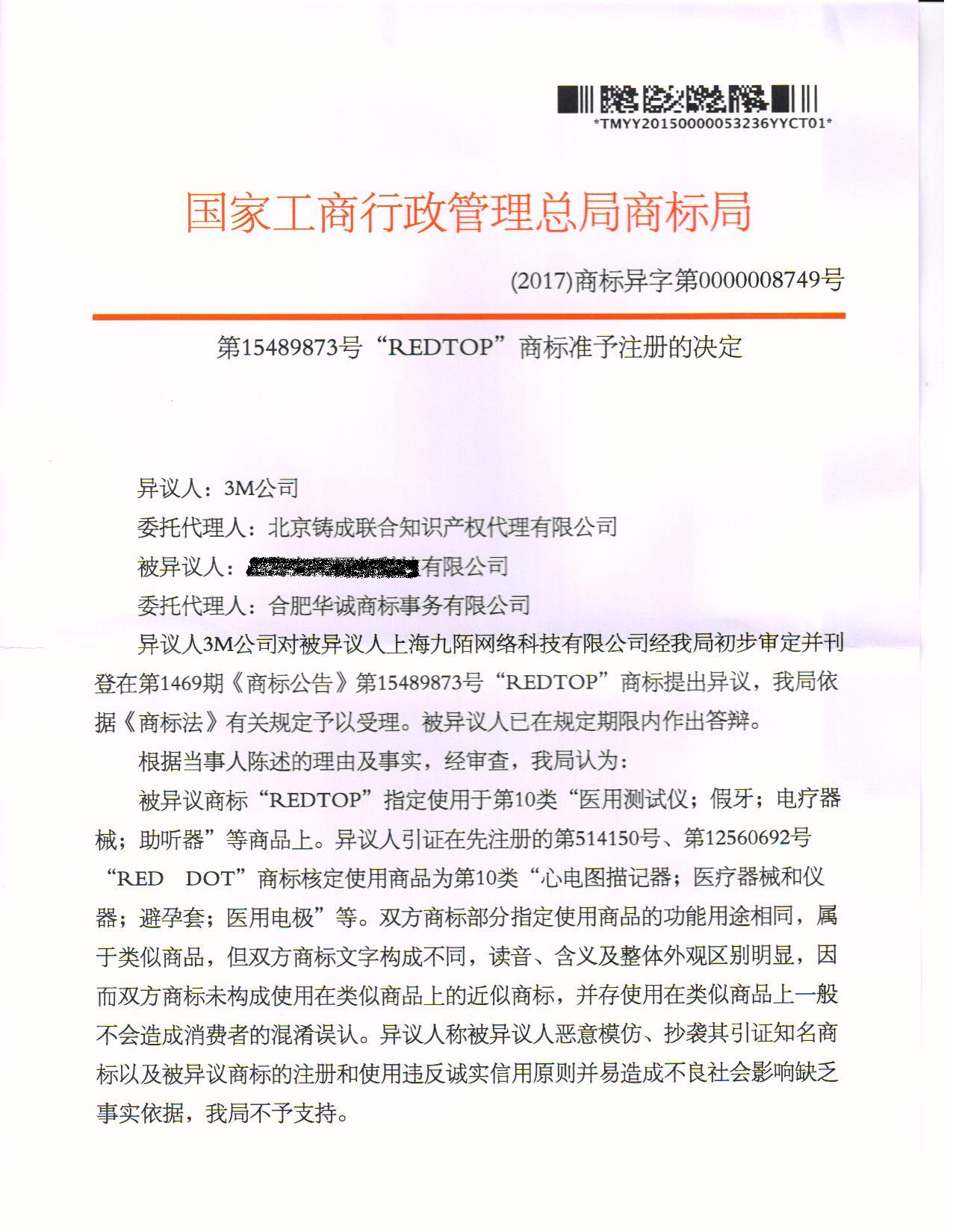 异议答辩成功裁定