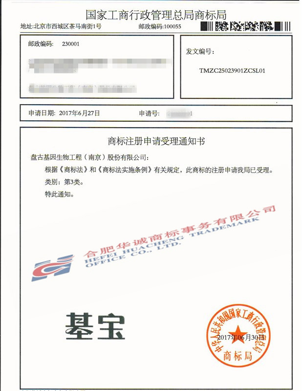 您委托我所代理商标注册申请,名称为“基宝”3类商标已被国家商标局受理。