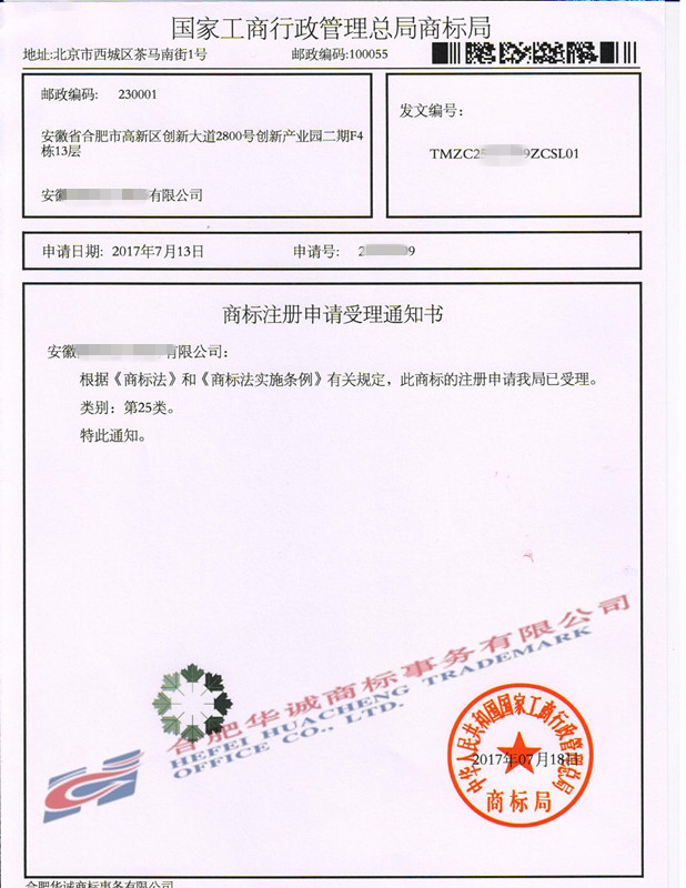 您委托我所代理商标注册申请,名称为“图形”25类商标已被国家商标局受理。