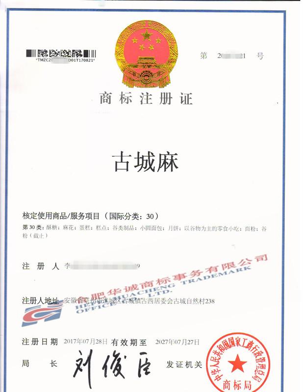 您委托我所代理商标注册申请,名称为“古城麻”30类商标注册证已下达。
