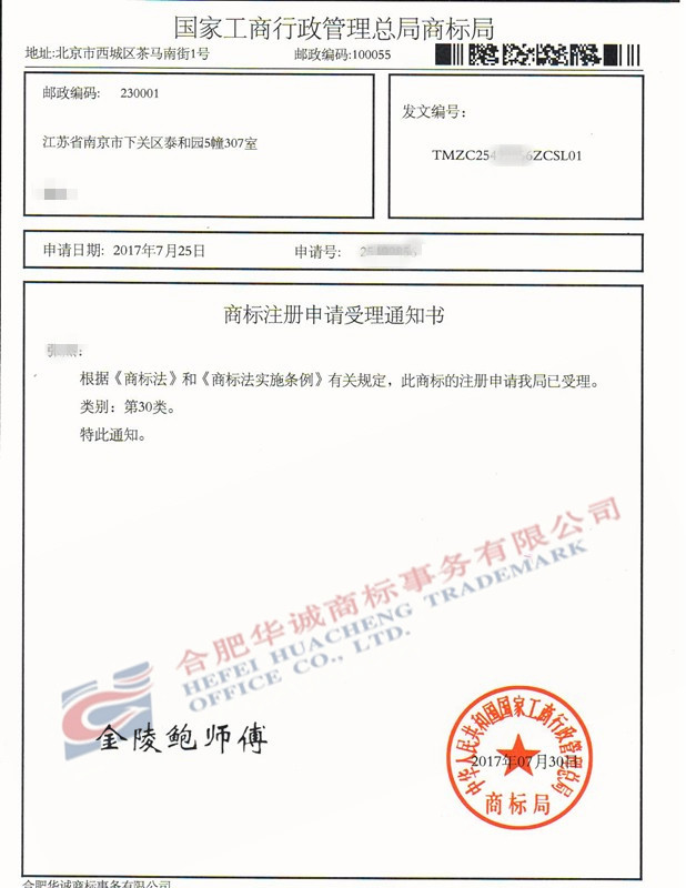 您委托我所代理商标注册申请,名称为“金陵鲍师傅”30类商标已被国家商标局受理。