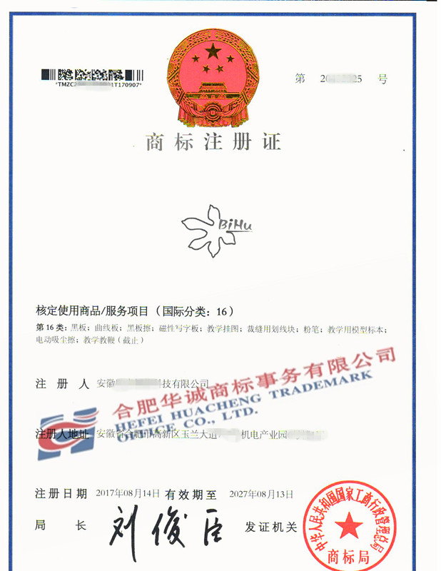 您委托我所代理商标注册申请,名称为“BiHu” 16类商标注册证已下达。