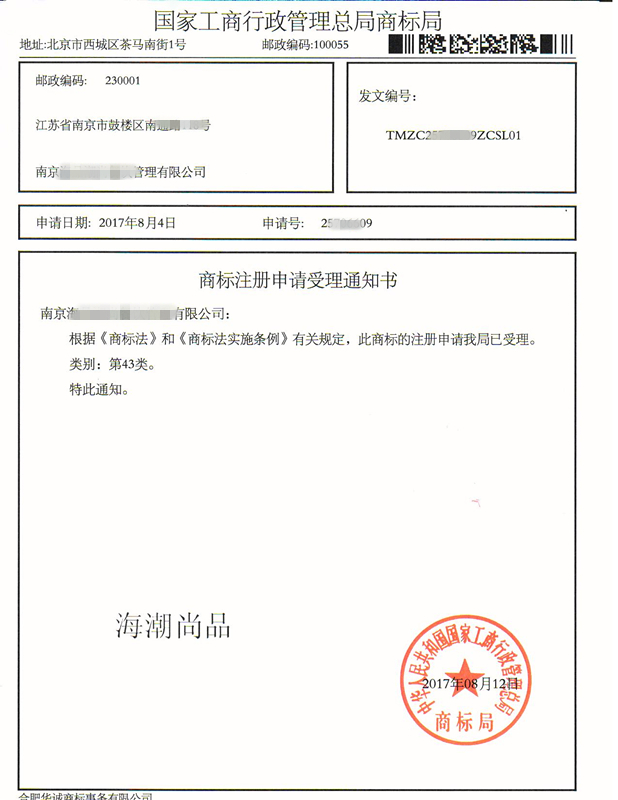 您委托我所代理商标注册申请,名称为“海潮尚品”43类商标已被国家商标局受理。