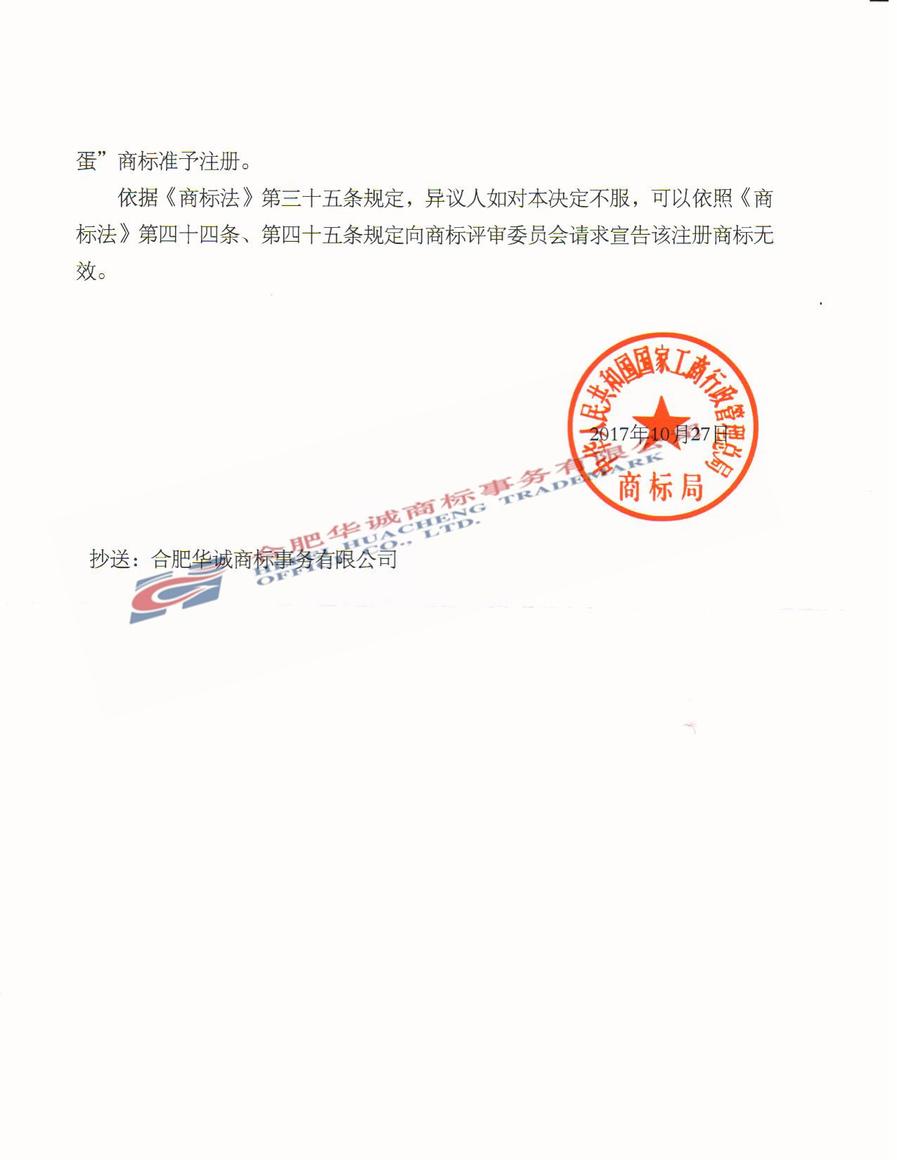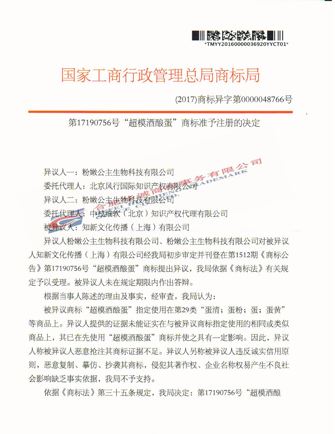 “超模酒酿蛋” 商标准予注册的决定