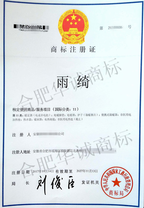 您委托我所代理商标注册申请,名称为“雨绮” 11类商标注册证已下达。