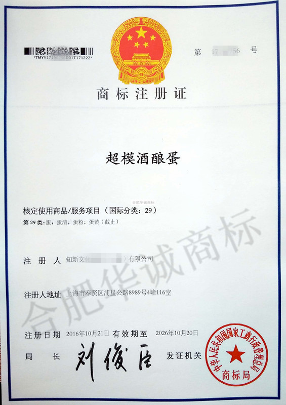 “超模酒酿蛋”29类商标注册证下达
