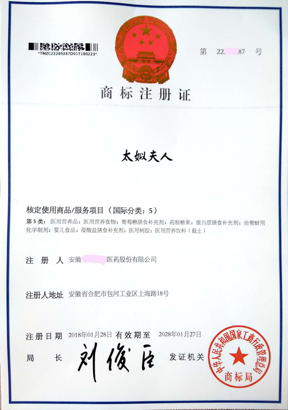 “太姒夫人” 5类商标注册证下达