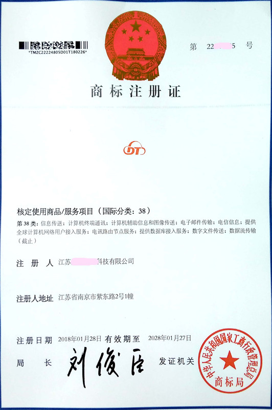 “DT” 38类商标注册证下达