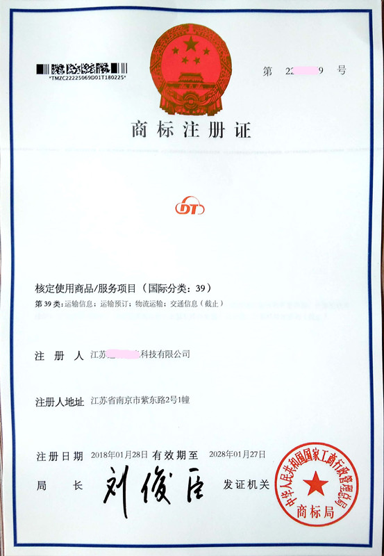 您委托我所代理商标注册申请,名称为“DT” 39类商标注册证已下达。