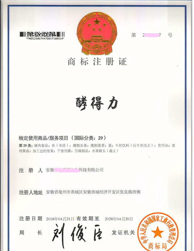 “酵得力”29类商标注册证下达