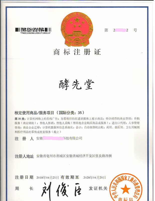 您委托我所代理商标注册申请,名称为“酵先堂”35类商标注册证已下达。