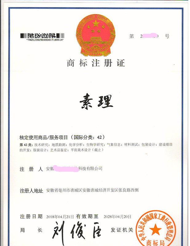 您委托我所代理商标注册申请,名称为“素理”42类商标注册证已下达。