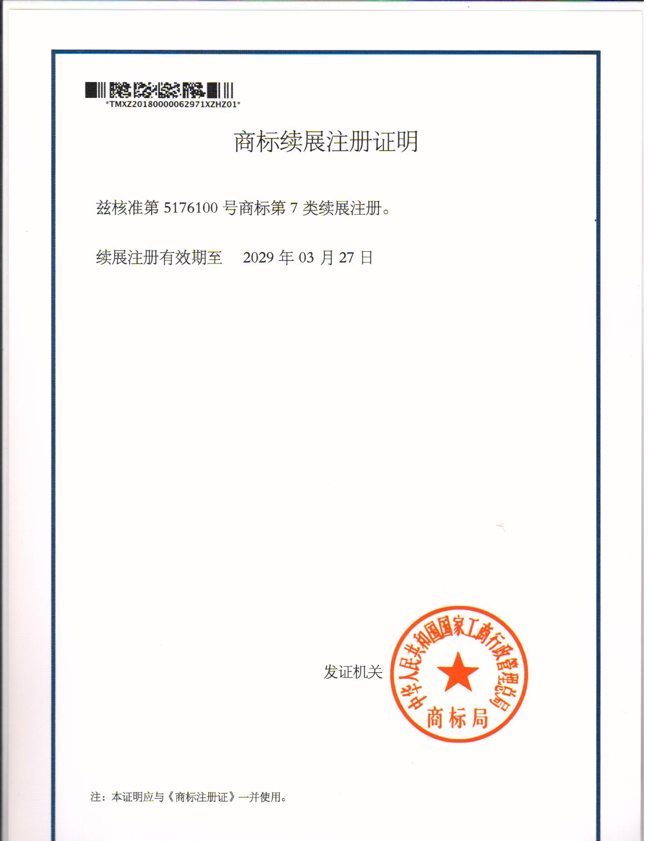 第“5176100”7类商标续展注册证明下达
