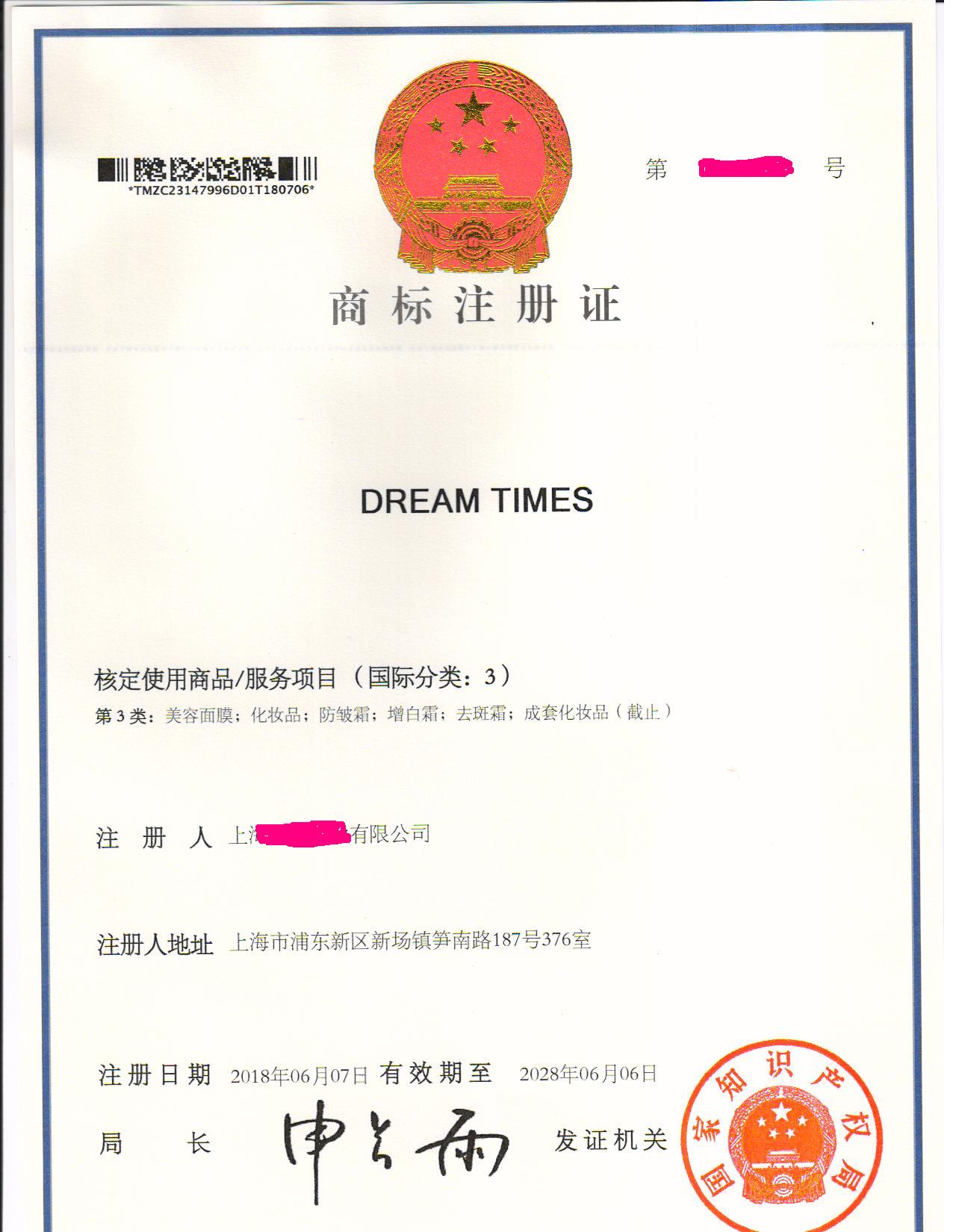 您委托我所代理商标注册申请,名称为“DREAM TIMES”3类商标注册证已下达。