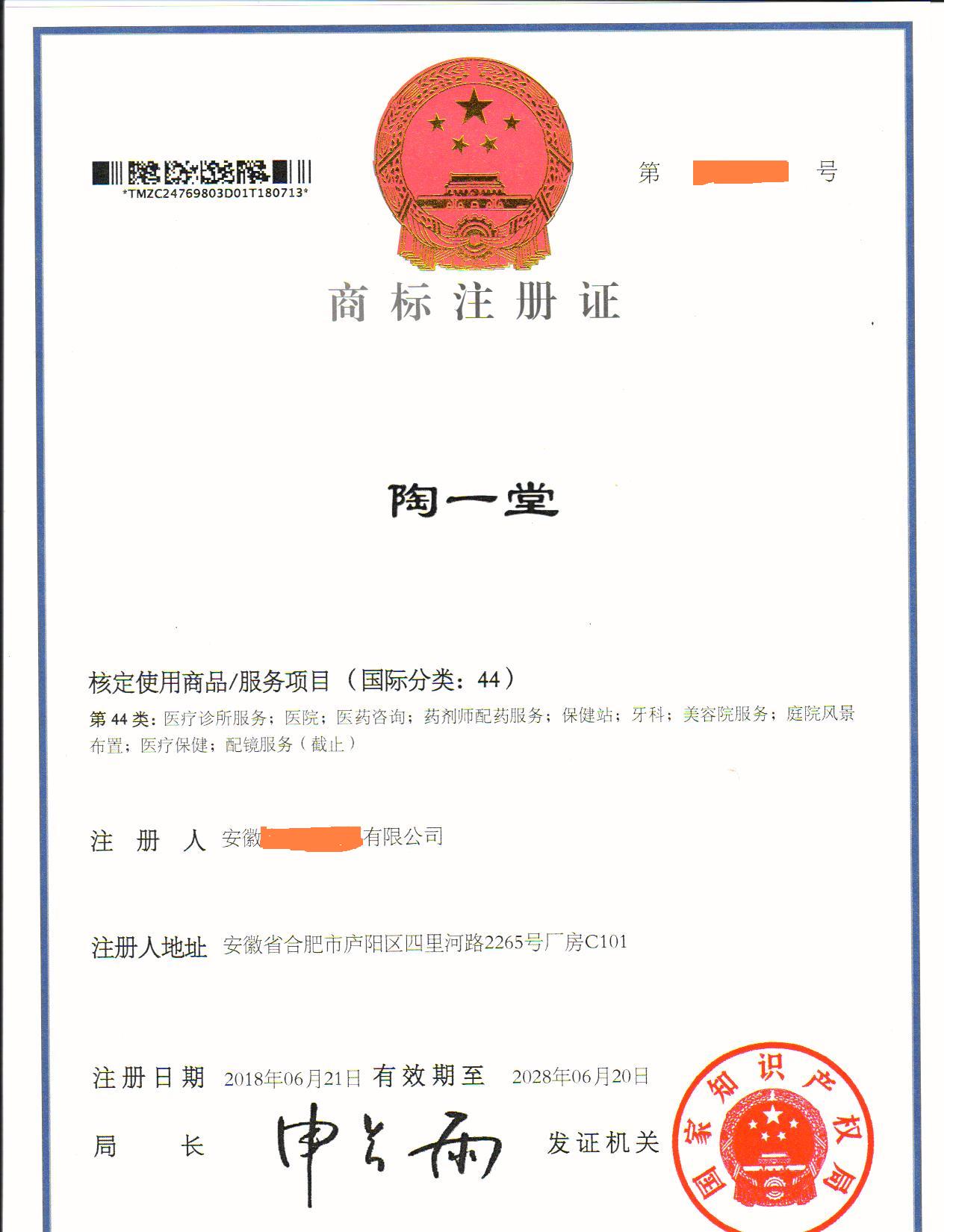 您委托我所代理商标注册申请,名称为“陶一堂”44类商标注册证已下达。