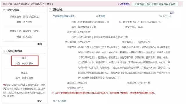 吴京作为大股东的北京登峰国际文化传播有限公司出资信息