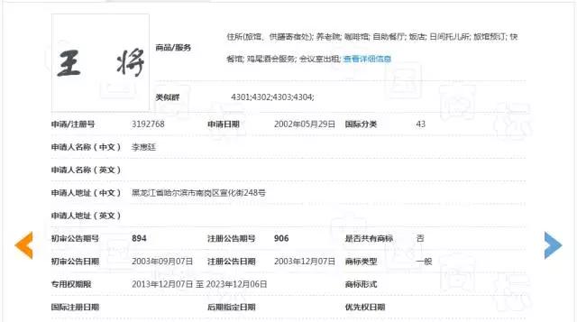辽宁省大连市中级人民法院一审查明,2002年5月29日,李某向国家工商行政管理总局商标局(简称商标局)申请注册"王将"商标,商标局于2002年7月31日受理,并于2003年12月向李某核发了第3192768号商标注册证,注册有效期限自2003年12月7日至2013年12月6日,核定服务项目为第43类,即住所(旅馆、供膳寄宿处);养老院;咖啡馆;自助餐厅;饭店;日间托儿所;旅馆预订;快餐馆;鸡尾酒会服务;会议室出租。1999年9月9日,哈尔滨王将食品有限公司(简称哈尔滨王将公司)成立并领取营业执照,法定代表人系李某;2001年11月28日、2003年6月17日,哈尔滨王将公司先后成立嵩山分店和大安分店,并领取了营业执照,其负责人均为李某。前述哈尔滨王将公司及其分店使用了"王将"和"王将"字样的招牌。