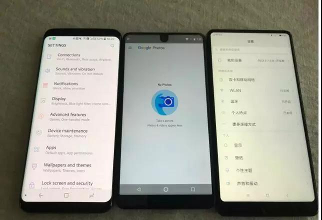 大家对众品牌全面屏的评价是酱紫滴:双月牙三星S8、美人尖Essential Ph1、小络腮小米Mix 2。指纹识别都在背后。材质分别是玻璃、陶瓷、陶瓷。